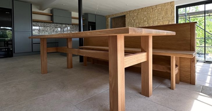 Specific detail was worked into every aspect of the project — internally this included limestone tile flooring with underfloor heating and bespoke joinery, including a custom built front door; curved porch bench; oak shelving; and an oak kitchen dining table and bench, which we made on-site.