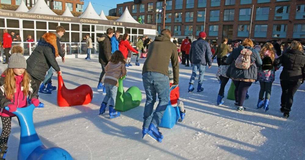 Gloucester Quays is giving away a Christmas family day on Saturday 17 or Sunday 18 December 2022, including a family ticket to its open-air ice rink, dinner at Five Guys, cinema tickets, a £100 Gloucester Quays gift card, a hamper packed with produce from the Festive Orchard Street Market and even parking for the day!