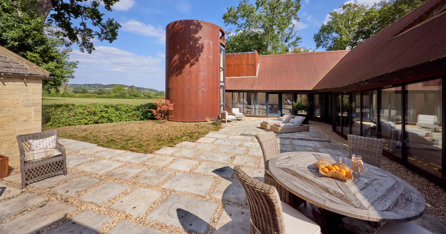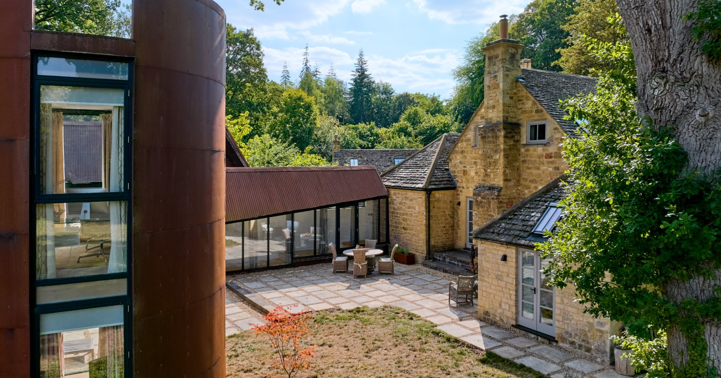 The original 1877 stone structure has been carefully restored, its honey-hued walls glowing against the sculptural Corten steel extension; a bold architectural statement that sets a contemporary tone against the timeless Cotswold scenery.