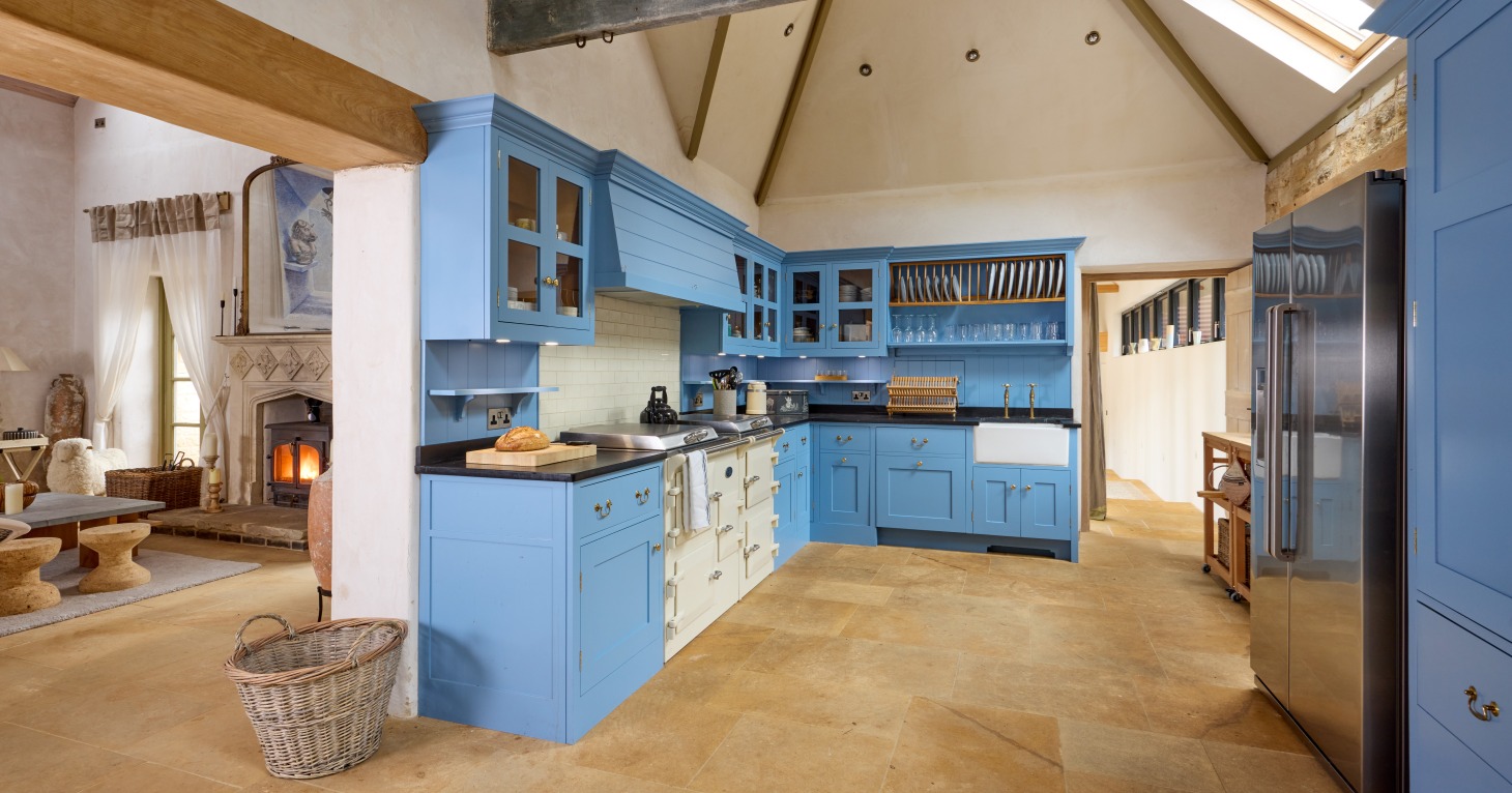 The open-plan layout then leads into a spacious kitchen and breakfast room, complete with bespoke cabinetry and exposed beams that speak to the building's history.