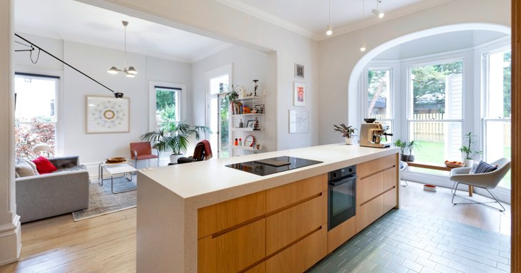Venturing inside, on the bottom floor you'll find the heart of the home — its bright, open-plan kitchen.