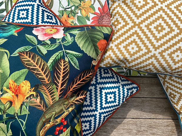 Re-cover some old cushions or pick up some pads and create your own from scratch. For outdoor use, soft cotton canvas or water-resistant and washable dralon is best. Look out for outdoor fabrics that have been UV treated to help them keep their colour, as well.