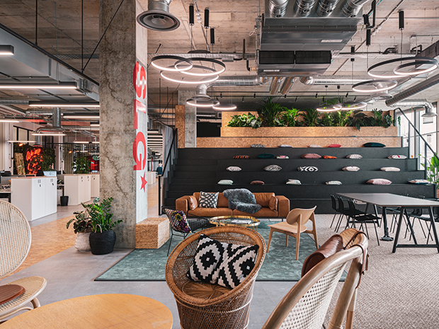 The interior, which was fitted by London-based Modus Workspace, features street-art on the walls, a skateboard ‘freeway’, palm trees, designer hammocks and even a pinball machine.