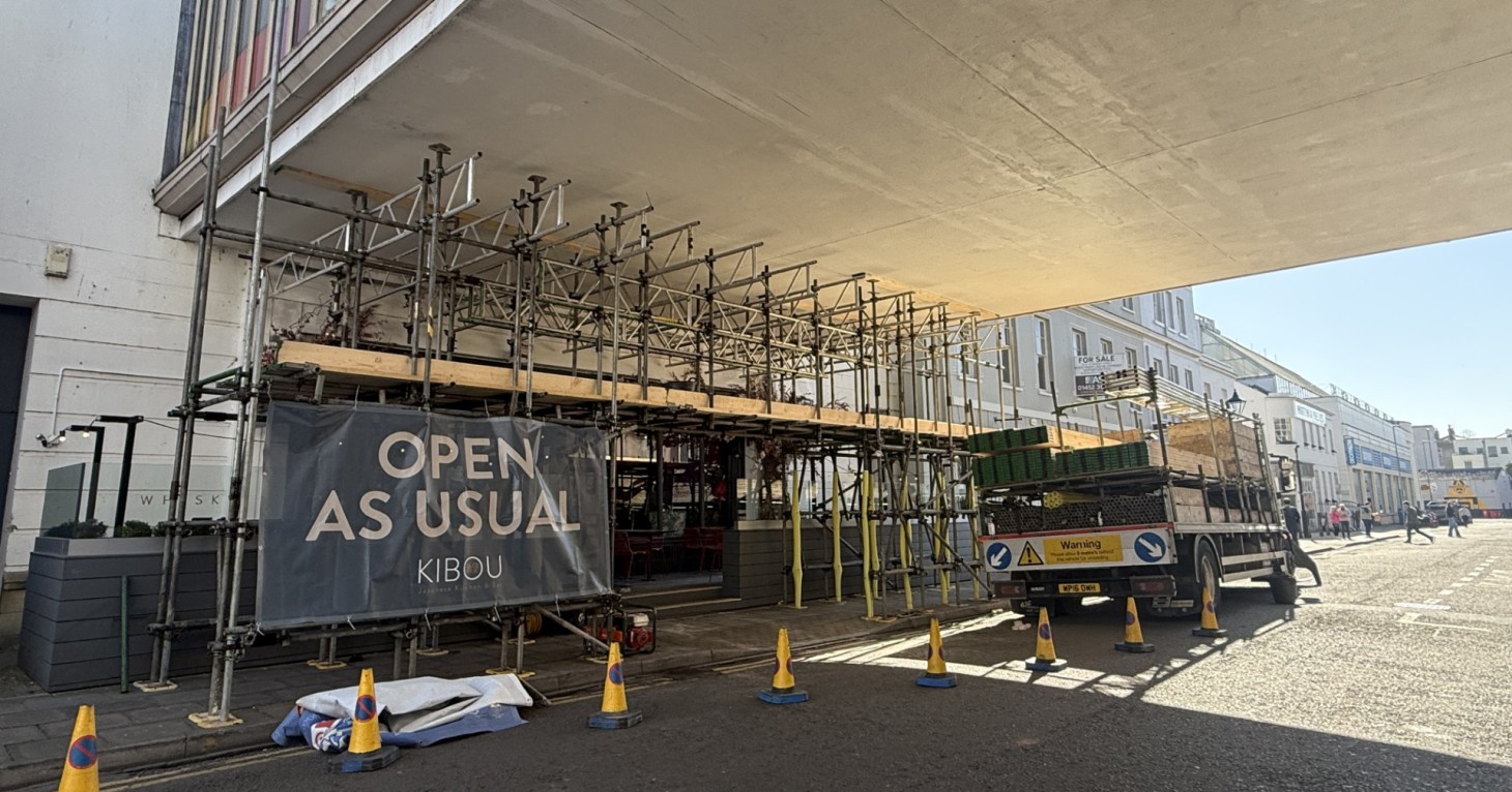 Scaffolding is being erected for the removal of Cheltenham’s Regent Arcade bridge linking the shopping centre to Cavendish House – marking the start of works on a new rooftop restaurant with panoramic views over Regent Street.