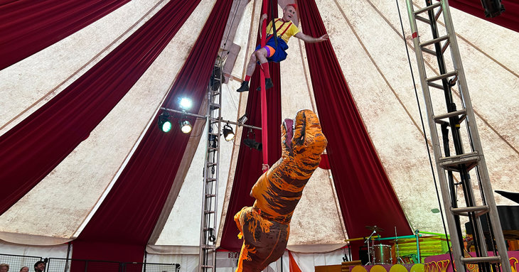 It may be hard to believe, but things get even more exciting after the interval, with the second act featuring a world-first high wire act, trouserless unicycling, aerial juggling, a time-travelling portaloo and even a dinosaur on aerial silks.