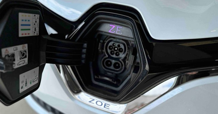The key features outside include 16-inch alloy wheels; tinted rear windows; electric folder wing mirrors; and a pearlescent white paint job, while the car's charging port can be found beneath the Renault badge on the bonnet.