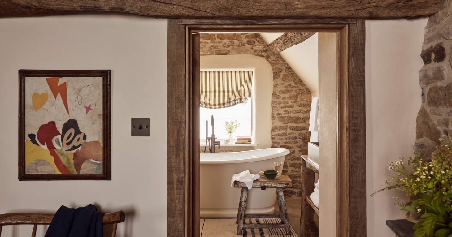Inside the 16th century traditional inn are reclaimed stable doors, upcycled leather from Daylesford Organic Farm, banquette seating and reclaimed wooden benches.