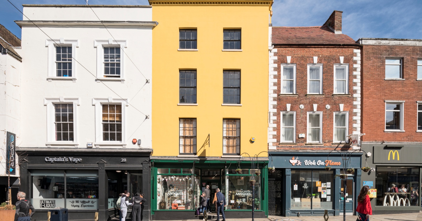 Its exterior has been redecorated with pigmented limewash; and also features reproduced historic signage for the Gloucester Antiques Centre and an 'elaborate' gargoyle carving, which was discovered during the repairs.