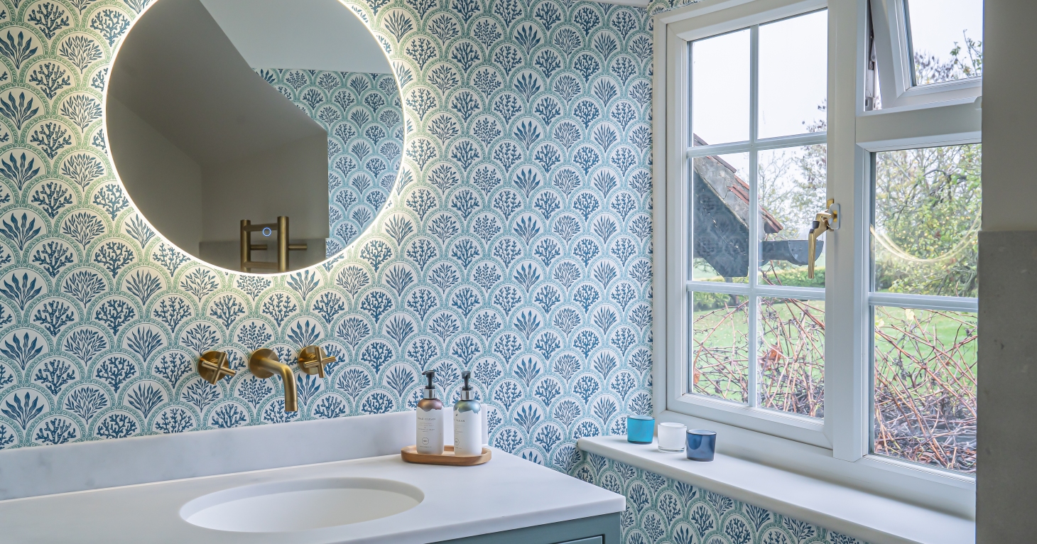 Its sloped ceiling and exposed beam above the basin led to several mirror revisions, before settling on a round mirror that 'harmonised perfectly with the rest of the room', with soft wallpaper, warm brass finishes and gentle lighting introducing 'warmth and personality'.