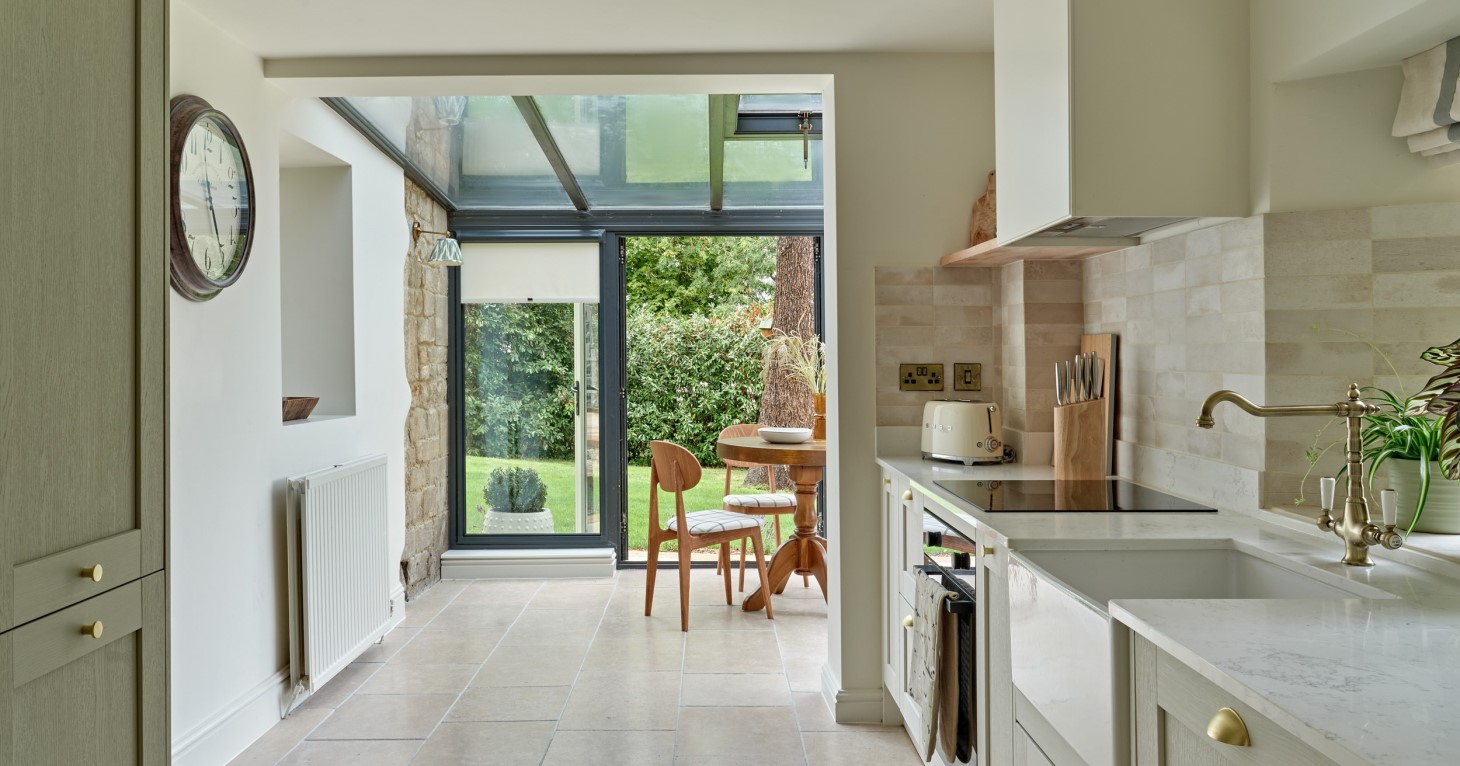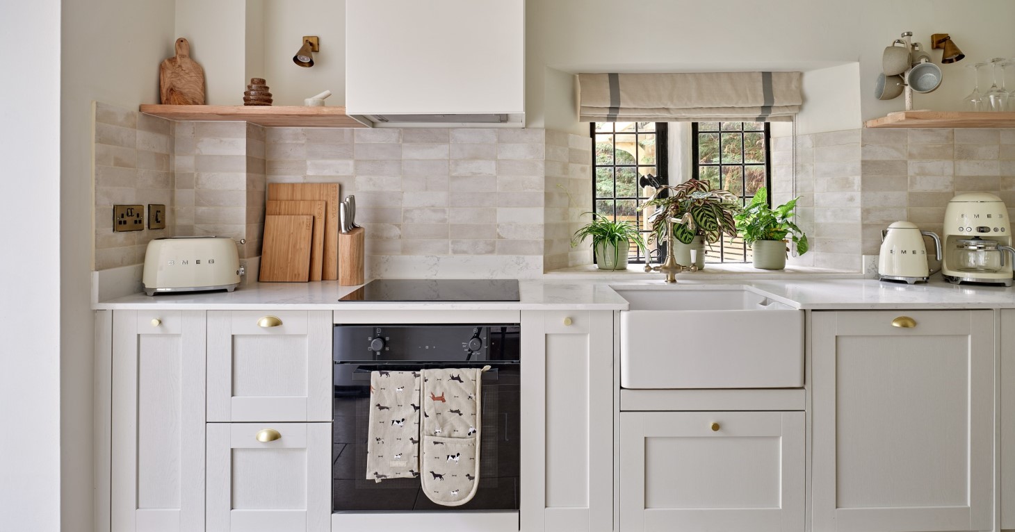 Calming, sage green cabinets are filled with cream earthenware and cream Smeg appliances provide all the creature comforts for a home-from-home experience.