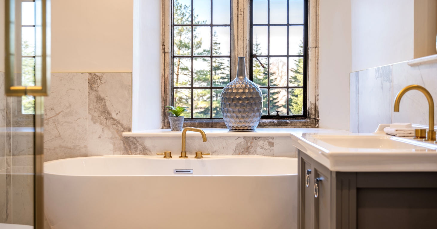 Design highlights include marble panelling, rolltop baths and bespoke joinery. The team also worked with artisan craftspeople and local suppliers, including Warwick Fabrics, based in Hardwicke in Gloucester.